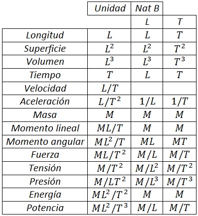 En la siguiente tabla la primera columna indica la magnitud que analizamos, la segunda indica las unidades que suele tener en sistema internacional (L es longitud, T es tiempo y M masa), y la tercera y la cuarta cómo quedarían en unidades naturales básicas si pasamos segundos a metros (3ª columna) o metros a segundos (4ª columna):