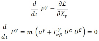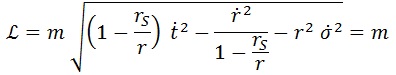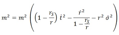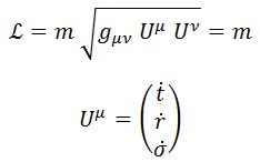 Donde estamos usando unidades geométricas. Esto nos permitirá conocer la métrica g, que será importante en aras de construir la lagrangiana relativista del sistema para una partícula inercial (libre) de masa m y cuadrivelocidad U: