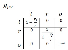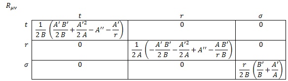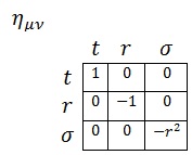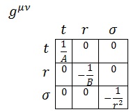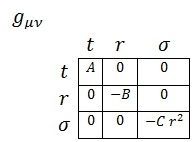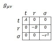 Donde A, B y C serán parámetros exclusivamente dependientes de r porque la simetría angular del problema exige que no dependan de σ y la simetría temporal (esperamos que sea estático) impide que dependan de t. Asimismo, redefiniendo r de forma que absorba C podemos asegurar que la métrica será expresable como: