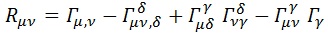 Donde evidentemente (por la simetría de los otros 2) los 3 índices superiores representan los distintos valores del índice superior de la conexión. Teniendo esto, podemos calcular el tensor de Riemann R: