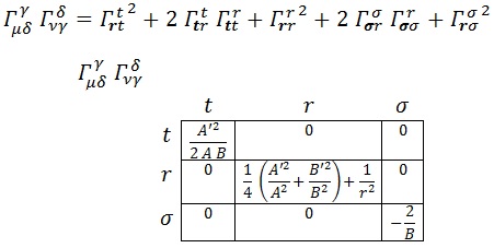 Ahora que tenemos al fin R, podemos usar la RG para dar algo más de forma a A y B. Como R es suma de elementos proporcionales a componentes de T, y este último por construcción es nulo en todo el espacio menos en el punto donde ubicamos la masa, tenemos que R debe anularse de modo análogo. En particular, anular su componente doblemente angular implica: