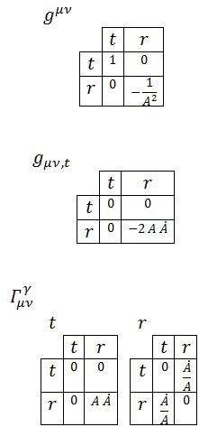 Teniendo esto, tenemos que hacer las cuentas usuales camino del tensor de curvatura de Ricci R. La métrica contravariante, la derivada temporal de la métrica (las derivadas temporales serán puntos sobre las variables) y la conexión afín son: