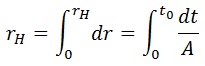 Donde estamos diciendo que el horizonte causal rH está a la distancia (en segundos luz) de sumar todo el tiempo del universo modulado por el factor de escala A desde que nació hasta el presente t0.