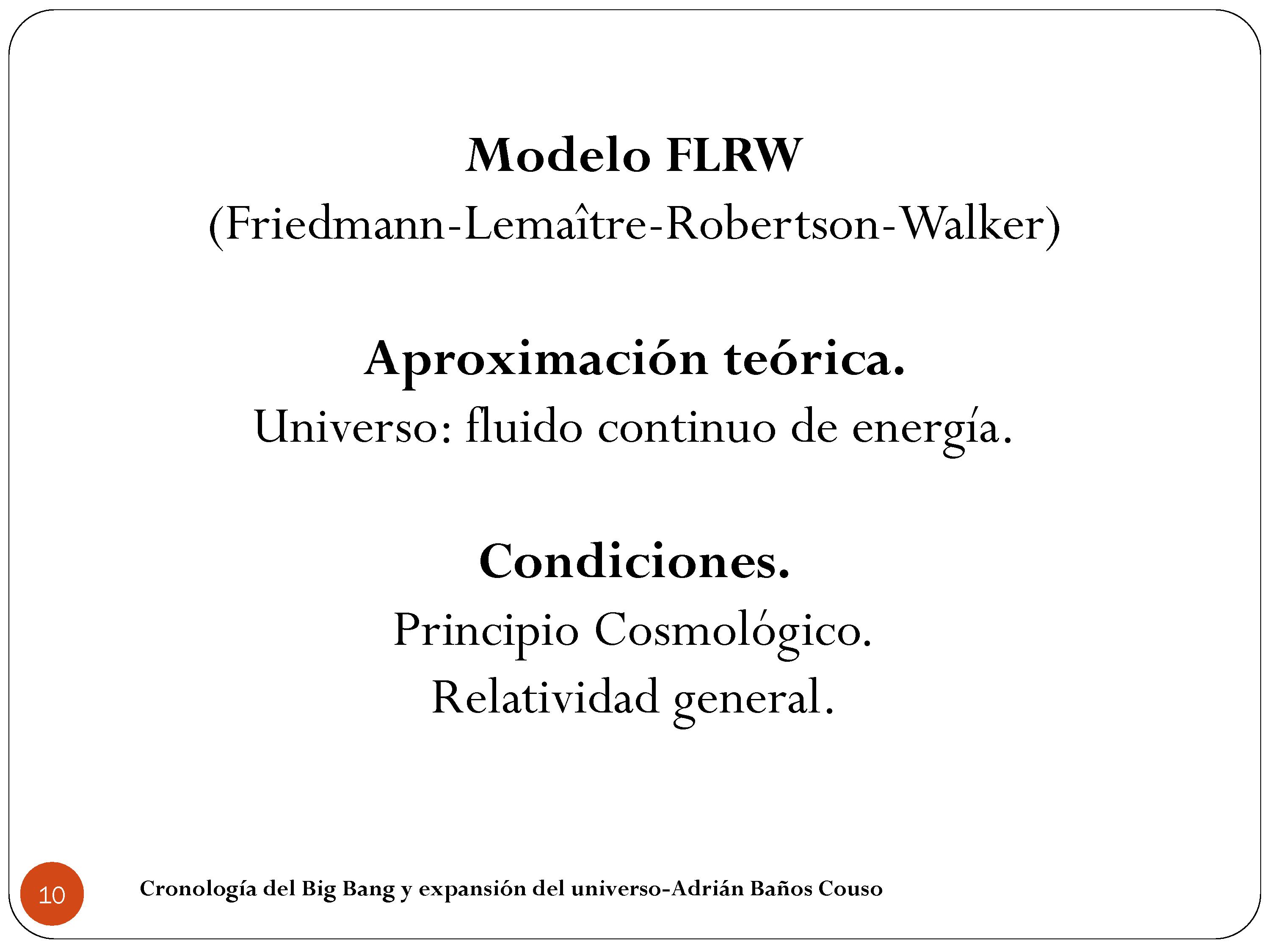 El modelo que vamos a tratar se llama el modelo de Friedmann-Lemaïtre-Robertson-Walker. Cada uno hizo cosas distintas, pero los vamos a considerar como juntos. Y va a ser una aproximación teórica en la que consideramos todo el universo como un fluido continuo de energía. ¿Qué quiere decir esto? Del mismo modo que yo cuando veo agua veo un líquido compacto y no veo todas sus moléculas, yo cuando veo el universo es un líquido compacto de estrellas, galaxias y demás. No vamos a ver sus componentes uno a uno, sino que los vamos a ver como si fuesen un continuo.