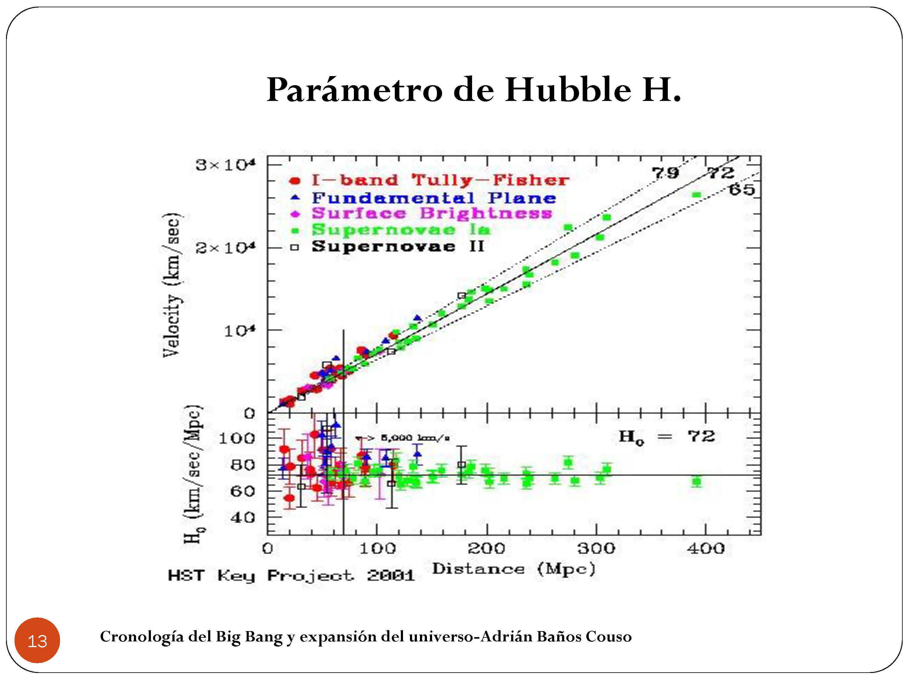 Entonces ya tenemos la velocidad a la que se alejan los astros y la distancia. Con esto ya estamos preparados para analizar el parámetro de Hubble que es lo que queríamos. Y si analizamos un poco más las medidas en el tiempo podemos sacar la aceleración. Y con esto ya tenemos analizada la evolución del universo en la cercanía de nuestro tiempo. Yo puedo decir que ahora mismo el universo se expande con una cierta velocidad, y que se expande con una cierta aceleración.