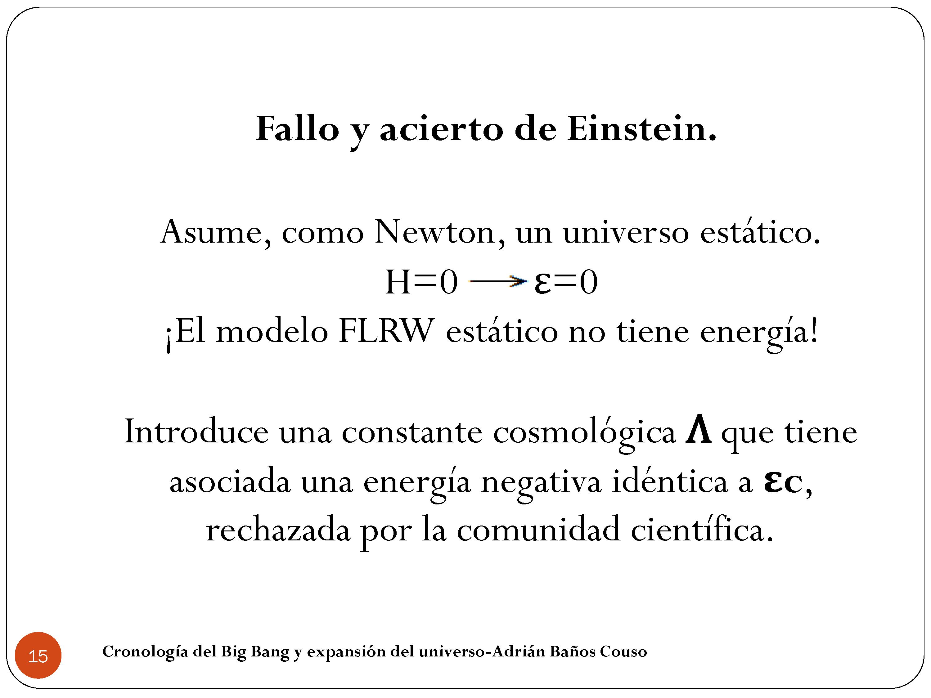 ¿Qué hizo Einstein? Bueno, introdujo la constante cosmológica Λ que contribuía a la densidad de energía, pero con el signo opuesto. ¿Entonces con esto qué haces? Metes una densidad de energía de masa, la restas toda porque sí metiendo la constante cosmológica, te quedas con energía cero, y te sale que el parámetro de Hubble es cero. ¿Pero qué pasa? Que esto no tenía ningún sentido y fue rechazado por la comunidad científica prácticamente al completo.