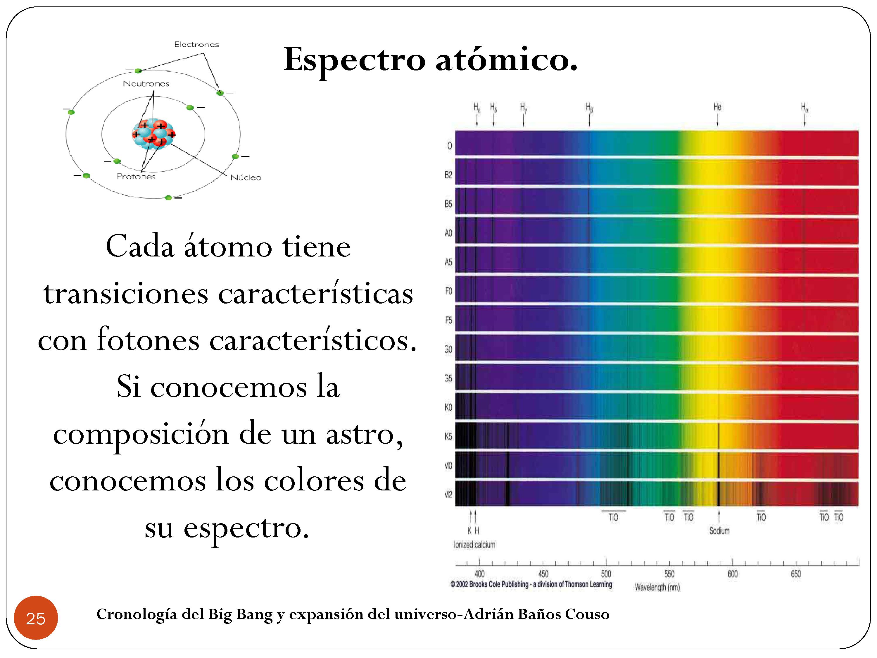 Entonces si conocemos la composición de un astro, conocemos sus átomos, y sabemos la luz que va a emitir, que es lo que dice ahí: si conocemos la composición de un astro conocemos los colores de su espectro. Entonces las estrellas se distinguen según estos criterios de rallas negras que son las que las caracterizan. Sabiendo esas líneas negras, sabemos su composición y su temperatura, y tenemos un modelo astrofísico de la estrella.