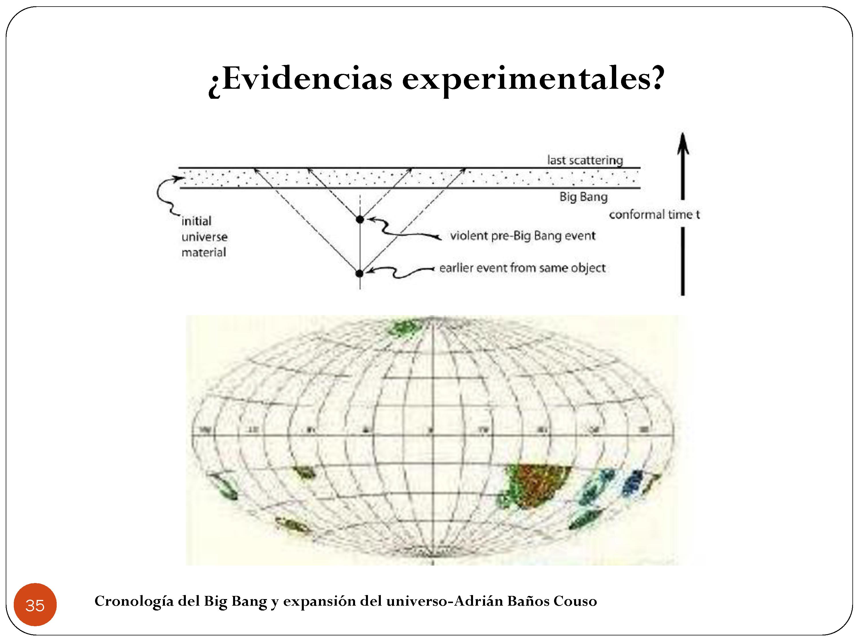 Ahí tenemos una línea línea que dice Big Bang. Esa va a ser la línea entre un universo y otro. Y arriba tenemos otra línea que dice «last scattering», que viene a ser «última dispersión», que es el momento en el que los átomos se forman y los fotones quedan dispersos. Entonces él dice «En el universo anterior, cuando se estaba expandiendo, seguramente hubiese un montón de agujeros negros gigantes. Y esos agujeros negros gigantes colisionarían en algún punto emitiendo un montón de energía». Vemos que hay dos puntos. Los llama «eventos violentos anteriores al Big Bang», y ahí se liberaron fotones. Y él lo que dijo que que si esto es correcto, esos fotones deberían aparecer superpuestos a los fotones que vemos hoy en día en el universo.