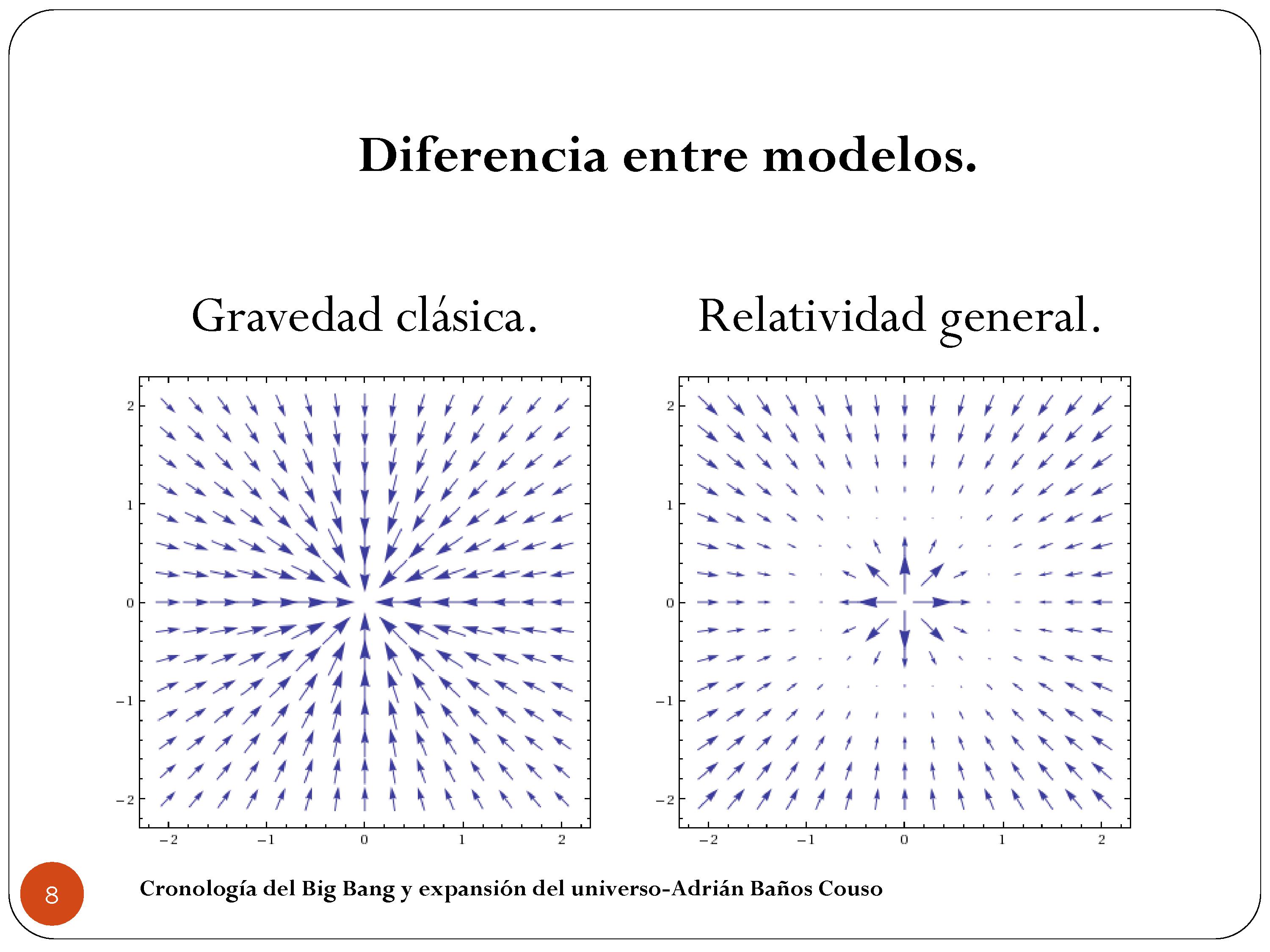 Vamos a ver la diferencia más grande entre los dos modelos, para que veáis que no tiene que ver mucho con la curvatura del espacio. En la gravedad de Newton yo puedo ubicar en este punto una masa. Sería una densidad infinita. Y el campo gravitatorio de fuerza que crea aumenta a medida que yo me acerco a este punto. Sin embargo, en la relatividad general, en la que se curva el tiempo, vemos que aparece una especie de círculo que no está dibujado, pero que se intuye bastante bien, al que llamamos horizonte de sucesos. Siempre que yo ubico una densidad infinita aparece un horizonte a su alrededor, y veis que dentro de ese horizonte la teoría predice que las flechas cambian de sentido. Entonces aquí, como seguramente habréis escuchado, se dice que el tiempo se invierte dentro del agujero negro. Por eso tenemos que decir que espacio y tiempo se intercambian detrás de la frontera para que las flechas sigan yendo hacia atrás. Como nadie ha estado nunca dentro de un agujero negro no sabemos qué es lo que pasa ahí dentro exactamente, pero lo importante es que la diferencia entre teorías es muy grande.