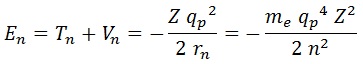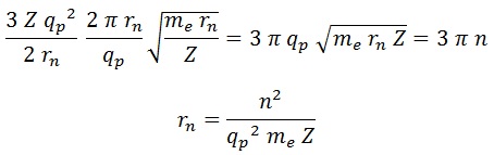 Teniendo esto y la lagrangiana, podemos sustituir en la igualdad que obtuvimos cuantizando la acción para obtener una expresión para el radio del átomo en función de n: