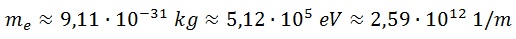Consecuentemente, la masa del electrón en quilogramos, electronvoltios y metros es: