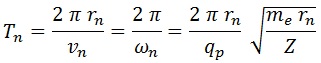 El periodo de giro es el perímetro de la circunferencia que recorre el electrón entre la velocidad con la que lo hace, que es a su vez el producto de radio por velocidad angular: