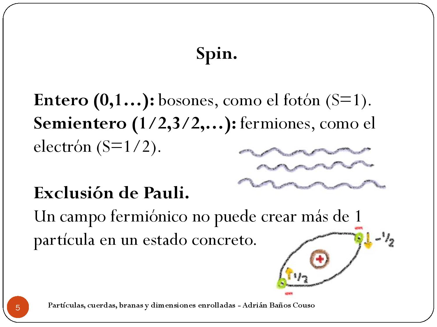 Decimos que las partículas con spin entero son bosones, como los fotones del campo electromagnético que tienen spin 1. Por el contrario, decimos que las partículas con spin semientero son fermiones, como el electrón con spin 1/2. Otros fermiones de los que es frecuente haber oído hablar son el protón y el neutrón.