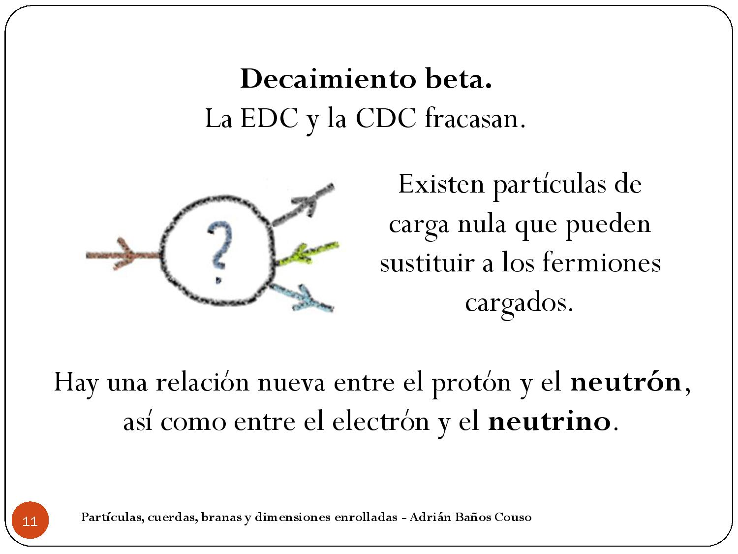 Es importante notar que esta interacción involucra cargas neutras, con lo que no es EDC, y partículas no compuestas de quarks, con lo que no es CDC. El electrón y el neutrino, por ir a parte de los hadrones, son denominados leptones.