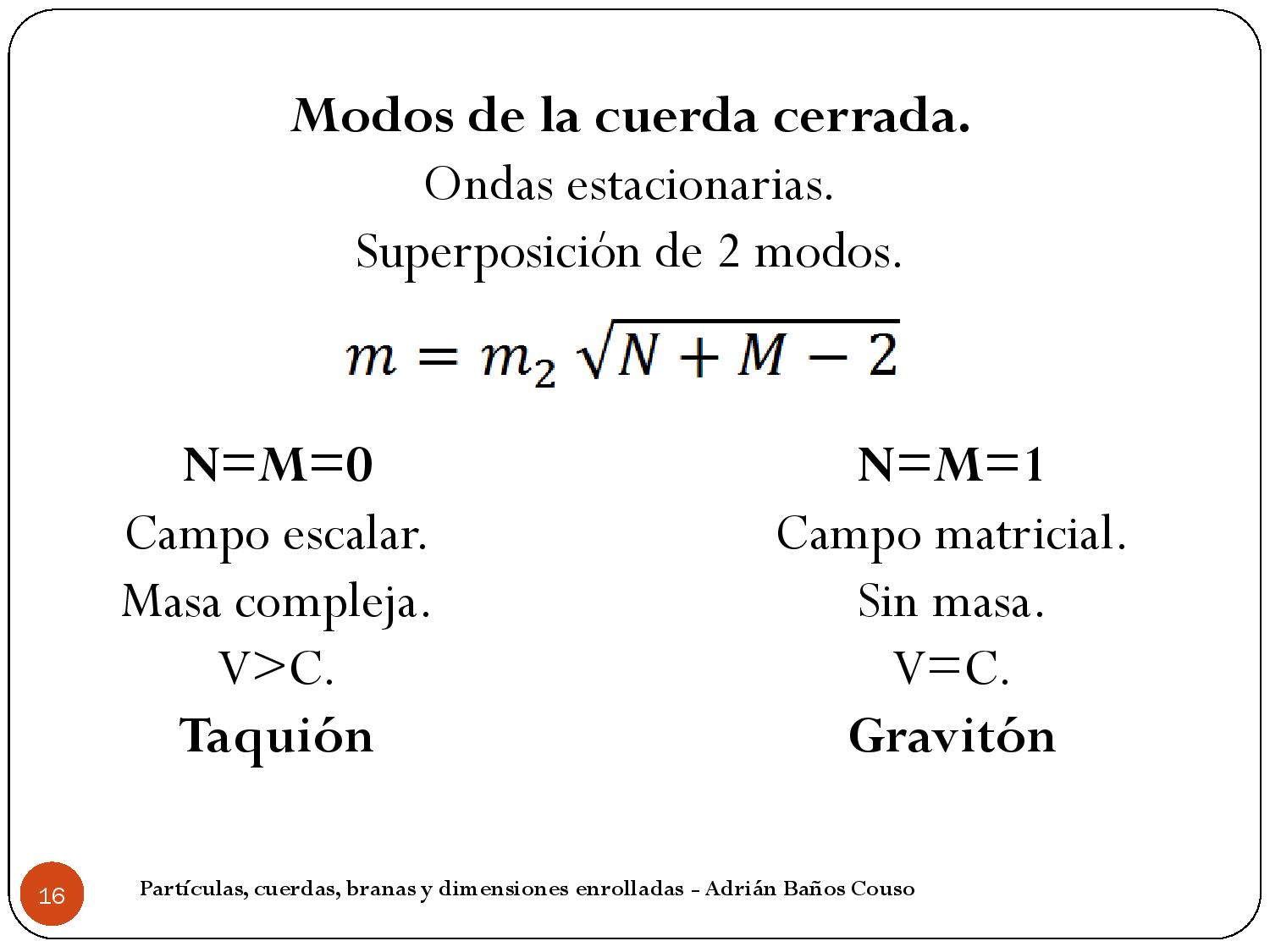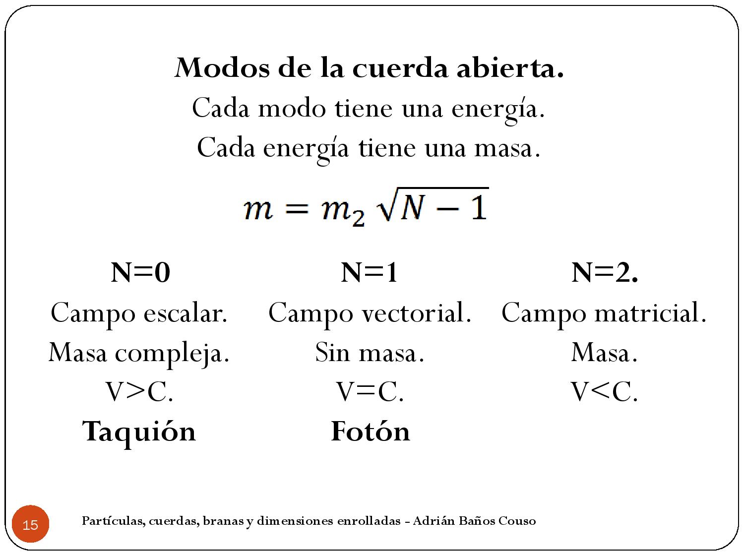 En el caso de cuerdas abiertas, esto implica que cada distinto modo de oscilación tenga asociada una masa dada por la fórmula de la diapositiva, donde N es el modo de oscilación y m2 es una constante sin fijar por el modelo.
