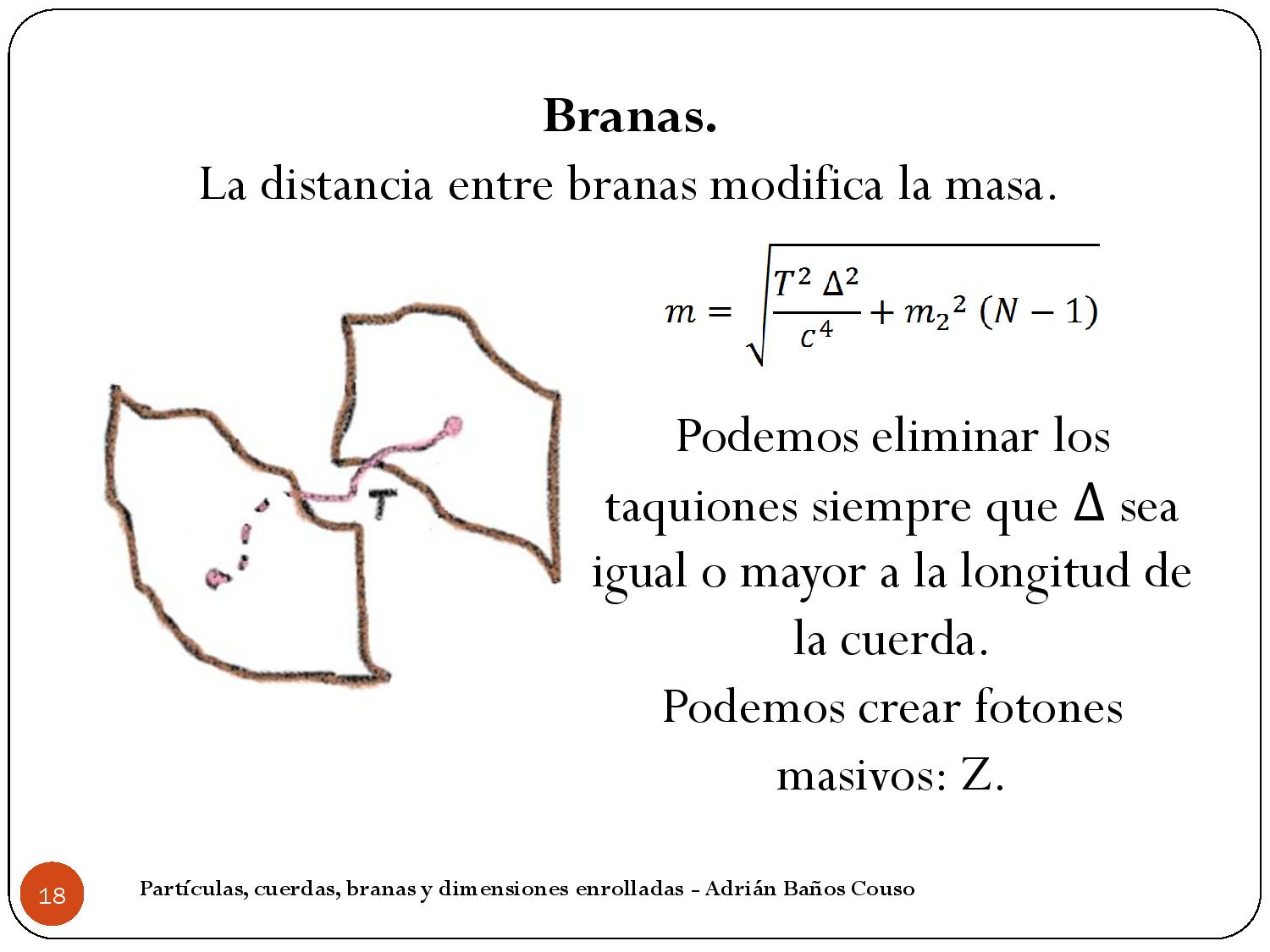 La atadura a branas crea una cierta tensión T en las cuerdas, y modifica la masa de las mismas según la distancia Δ entre las branas del punto inicial y del final como se ve en la fórmula. En particular, esto permite suprimir los taquiones siempre que dicha distancia sea mayor o igual a la longitud de la cuerda. Además, permite crear fácilmente fotones masivos, que vendrían a ser partículas Z.