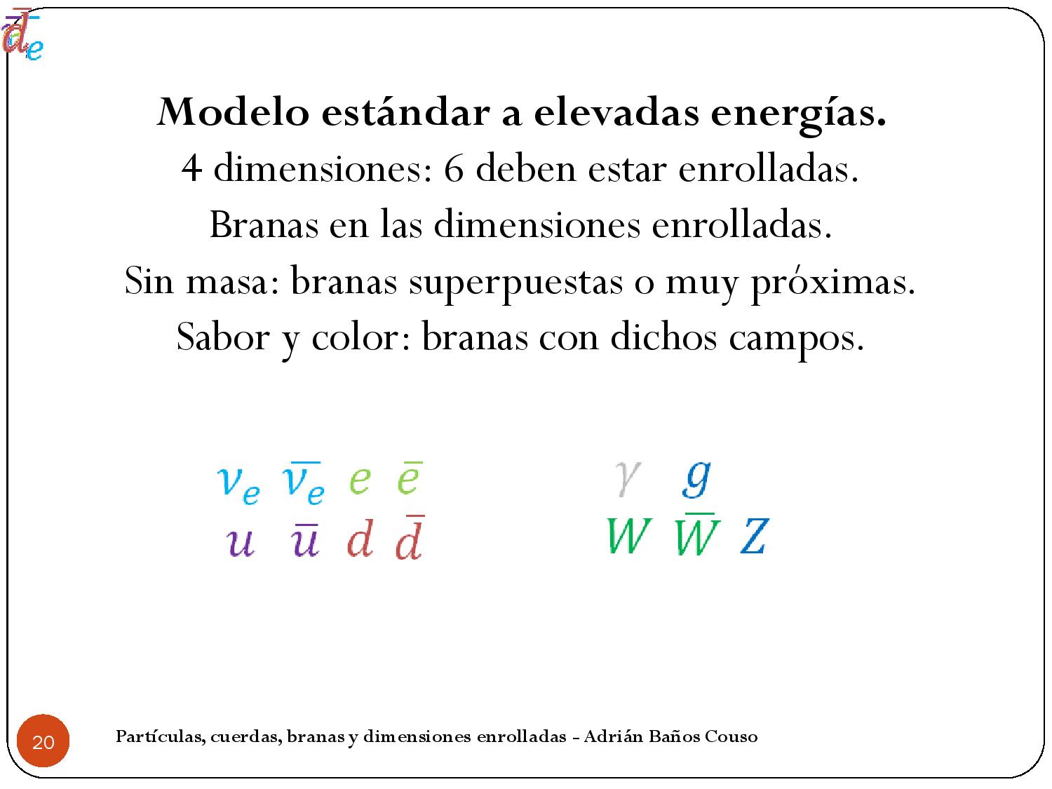 Como se puede ver el gráfico, aproximadamente la mitad de la ponencia irá sobre el Modelo Estándar de la física de partículas para que tengamos unas bases sobre las que movernos y después entraremos en el tema real que es la Teoría de Cuerdas, donde veremos los conceptos de cuerdas, branas, dimensiones enrolladas, alguna cosa sencilla que se puede hacer con todo ello para reproducir grosso modo el modelo estándar y un repaso a todas las críticas razonables que se pueden hacer sobre este tema.