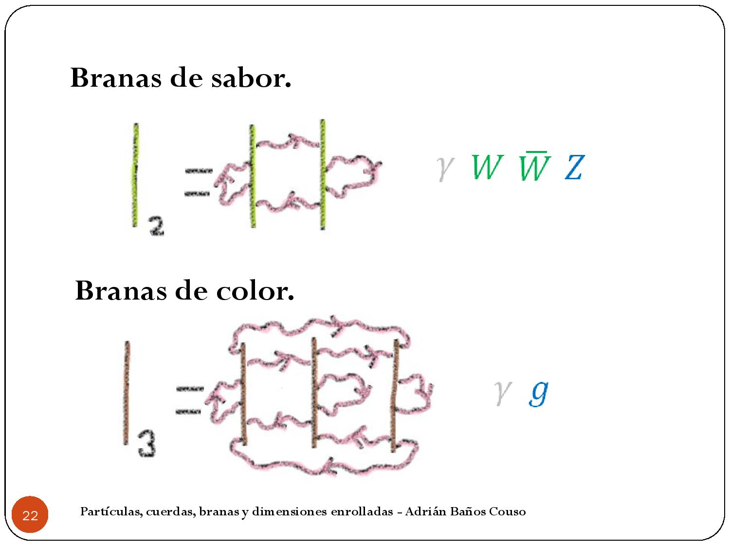 En particular, estaremos interesados en crear una brana doble (2 ocupando el mismo espacio) con los 2 campos de sabor. Al estar pegadas, las oscilaciones primeras serán bosones sin masa y de las 4 combinaciones posibles salen un fotón, las 2 W y la Z.
