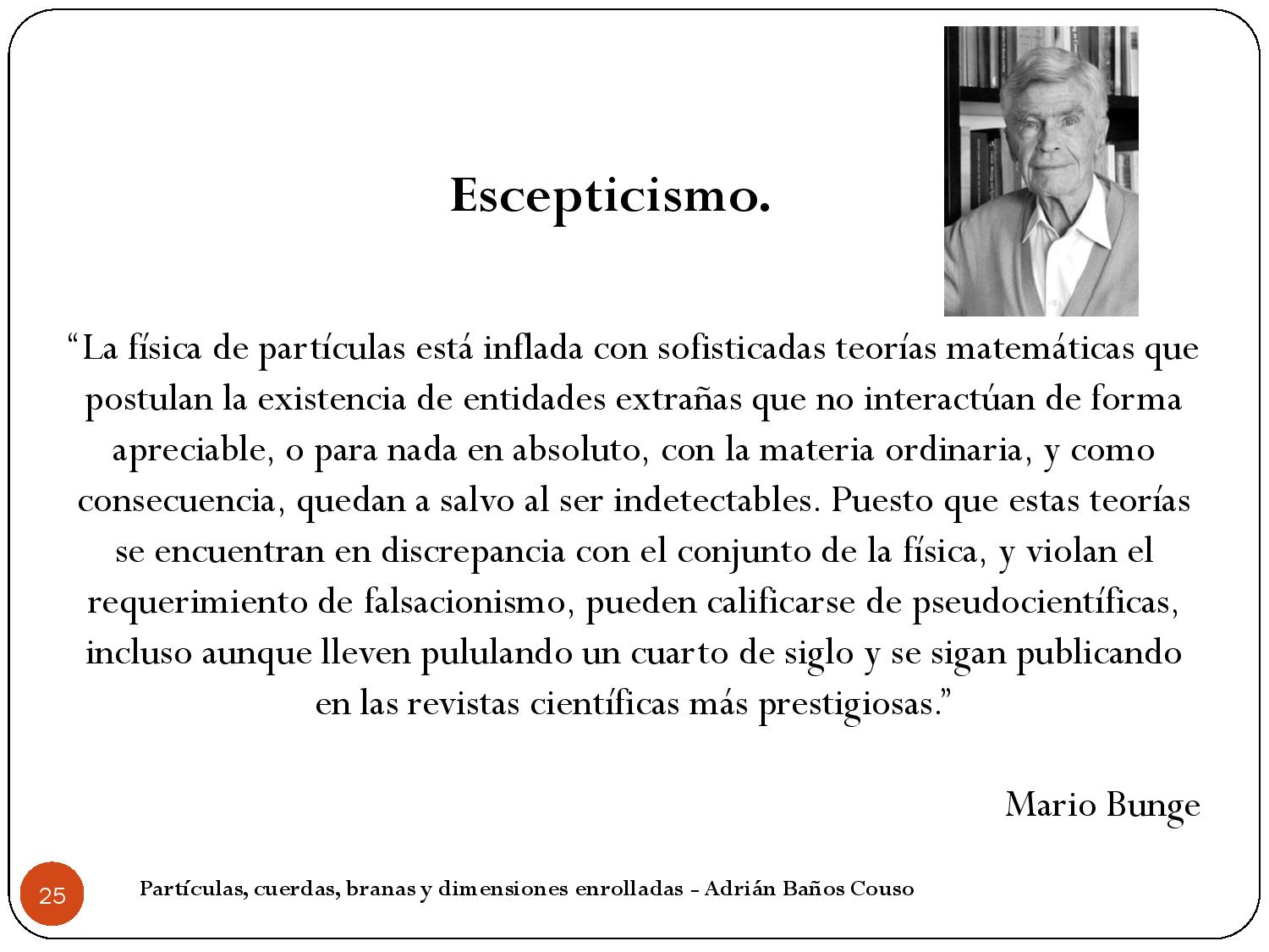 Debido a que los modelos de cuerdas parecen abarcar todo sin pruebas, se han ganado muchas críticas, entre la que destaco la de Mario Bunge en la diapositiva.