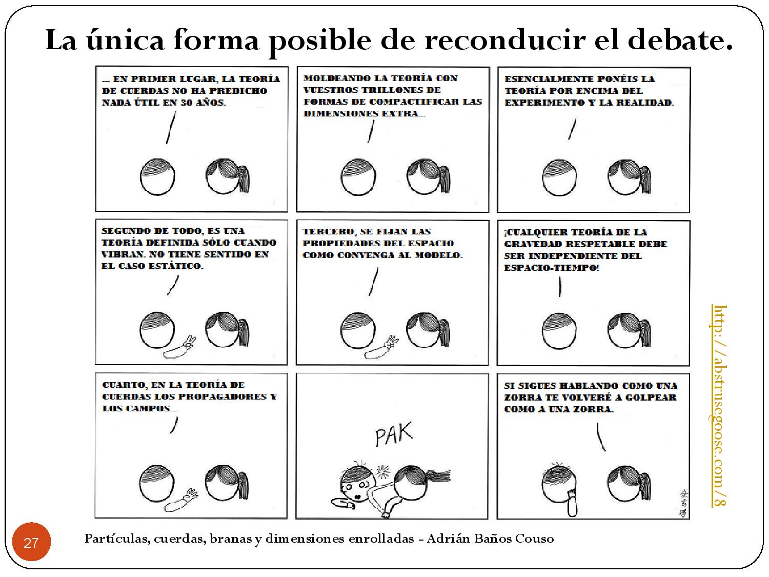 «-… En primer lugar, la teoría de cuerdas no ha predicho nada útil en 30 años. Moldeando la teoría con vuestros trillones de formas de compactificar las dimensiones extra… esencialmente ponéis la teoría por encima del experimento y la realidad. Segundo de todo, es una teoría definida sólo cuando vibran. No tiene sentido en el caso estático. Tercero, se fijan las propiedades del espacio como convenga al modelo. ¡Cualquier teoría de la gravedad respetable debe ser independiente del espacio-tiempo! Cuarto, en la teoría de cuerdas los propagadores y los campos…