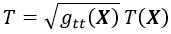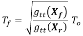 Como consecuencia de este hecho, si vemos un cuerpo quieto en un punto X del espacio-tiempo curvado, el tiempo T que le asignaremos T(X) estará relacionado con el tiempo propio suyo mediante el coeficiente métrico temporal gtt:
