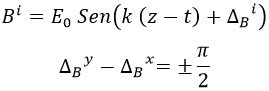 En lo que respecta al campo magnético, sabemos que para que su diferencia de módulos se anule también tiene que tener por módulo E0, y solo habría que investigar qué sucede con sus desfases ΔB, que por cumplir las mismas condiciones que en el campo eléctrico también tendrán una diferencia relativa de un cuarto de ciclo: