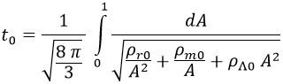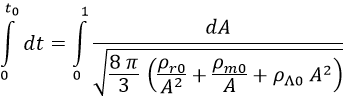 Y de aquí llegamos a una ecuación integral con el factor de escala por un lado y el tiempo por el otro. El tiempo nos interesa integrarlo desde 0, el origen del universo, hasta el presente t0. El factor de escala desde 0, el universo con distancias internas nulas, hasta 1, el factor de escala actual: