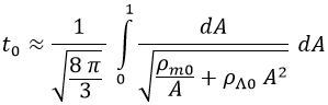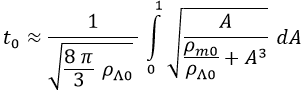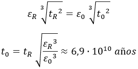 Sabiendo esto, podemos relacionar dos etapas sabiendo la energía característica de ambas. Así pues, si suponemos que desde la recombinación hasta el presente la materia ha sido la gran protagonista del universo, obtenemos que el tiempo actual t0 es de 69000 millones de años: