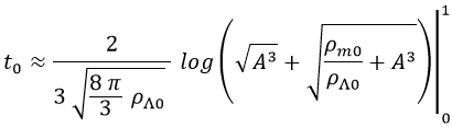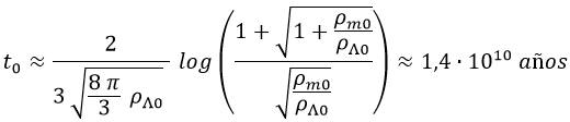 Finalmente, para sustituir los límites de integración tenemos en cuenta que la resta de logaritmos es el logaritmo del cociente y obtenemos los 14000 millones de años de edad del universo: