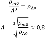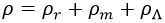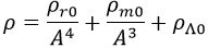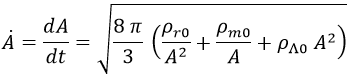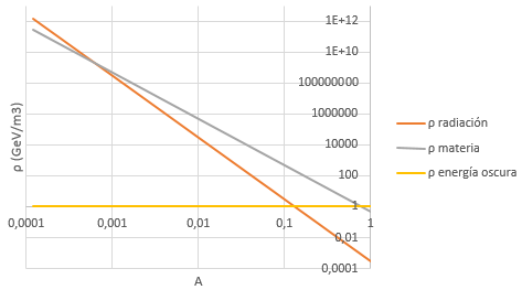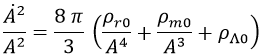 Y si tenemos en cuenta que la densidad de radiación decae con la cuarta potencia del factor de escala A y la de materia con el cubo, podemos relacionar la densidad de energía en cualquier instante con las que medimos en el instante actual mediante la relación:
