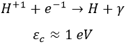 Una vez que ya había núcleos en principio podría haber empezado a haber átomos, pero esto siguió siendo complicado por la elevada temperatura. Un núcleo de hidrógeno con carga positiva (un protón) puede juntarse con un electrón de carga negativa para dar lugar a hidrógeno neutro bajo el único precio de que el electrón emita un fotón γ con una energía εc del orden del electronvoltio, como vimos en las entradas sobre orbitales atómicos: