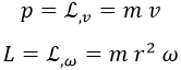 Dicha lagrangiana tiene asociados el siguiente momento lineal p y angular L, si bien el primero no se conserva: