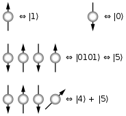 Supongamos que tenemos un generador de pares de electrones tal que siempre produce uno con un espín positivo y otro con un espín negativo y envía cada uno en una dirección, sin prefijar qué espín lleva cada uno de ellos. El estado cuántico ψ que describe el sistema de los dos electrones es una combinación del estado en el que el primero tiene espín positivo y el segundo negativo y su opuesto: