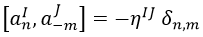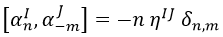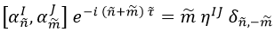Lo cual, comparando con el conmutador cuántico usual que deben cumplir los operadores de creación y destrucción, lleva a la conclusión de que eso es lo que son a-n y an para la frecuencia de vibración n, siendo los primeros operadores de creación en el caso de n positivo y al revés en el caso opuesto: