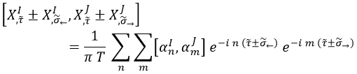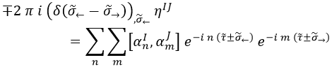 Una vez armados con esto, vamos a aplicar dos transformaciones de Fourier a cada miembro de nuestra ecuación de la cuerda para suprimir la dependencia con las diferentes σ. Dicha transformación de Fourier simplemente consiste en integrar entre 0 y 2π lo que tengamos, multiplicado por una cierta exponencial compleja de fase proporcional a σ mediante un número entero y dividimos todo entre 2π.