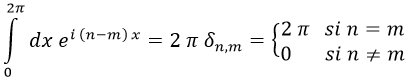 Su validez es obvia sin más que tener presente la fórmula de Euler de los números complejos y el hecho de que la integral de cualquier función tipo seno o coseno dentro de su periodo es nula. La delta es una delta de Kronecker.