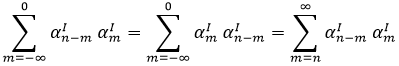 Ya queda poco. A partir de esta expresión podemos reetiquetar el primer término del segundo sumatorio cambiando m por n+m, de modo que finalmente obtenemos: