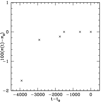 «Los valores históricos de π en comparación con su valor actual π0, como una función del tiempo t-t0, siendo t0 el tiempo actual. El tiempo está expresado en años, y la escala del eje vertical ha sido seleccionada de forma que las variaciones parezcan mayores de lo que realmente han sido». Nótese que la variación está multiplicada por 100 porque sí.
